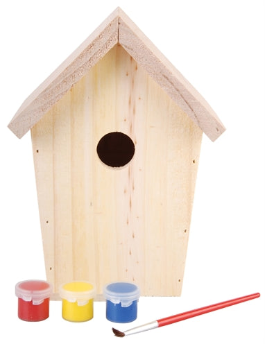Schilder met de kwast jouw eigen vogelhuisje in hele mooie kleuren! Houten vogelhuisje met drie kleuren verf en kwast. Meng zelf bijvoorbeeld geel met blauw om een groene kleur te krijgen of meng rood met geel om een oranje kleur te krijgen.