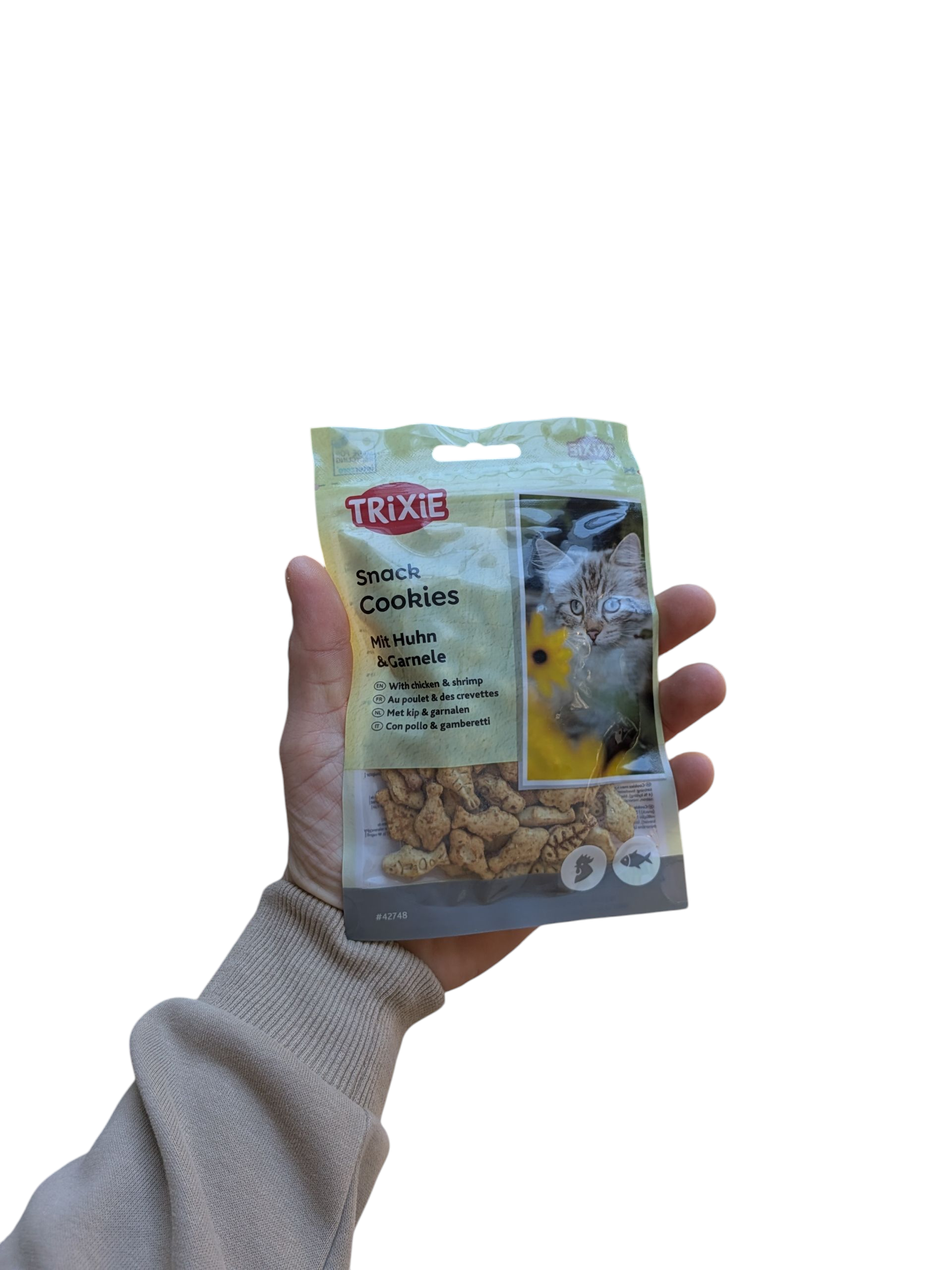 De Trixie Cookies Met Kip en Garnalen is een heerlijke kattensnack met kip- en garnalensmaak. In de vorm van kleine visjes, perfect om te geven als tussendoortje.