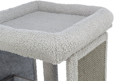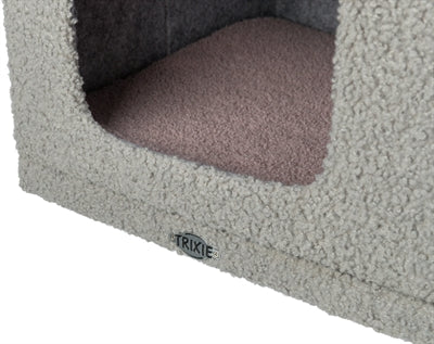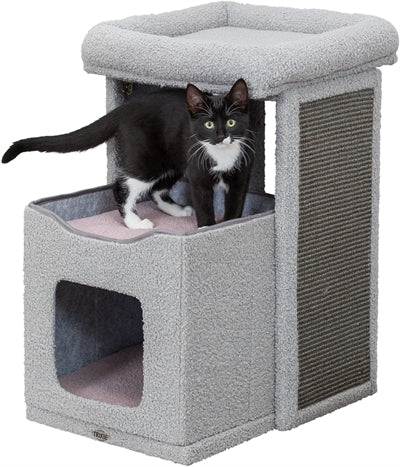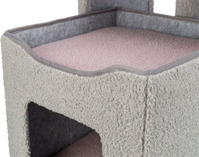 De Trixie Kitten Krabpaal Carlita Grijs/Lila 63 cm is een krabpaal voor kittens in schapenvacht look met schuilplaats en twee ligplekken. Krabben is voor katten een natuurlijke bezigheid: zo houden zij hun nagels bij en markeren zij hun territorium. Om te voorkomen dat jouw kitten zijn nagels leert slijpen aan het meubilair, is het aan te raden veel krabmogelijkheden in huis te hebben. Daarvoor is deze handige krabpaal uitermate geschikt! De paal bestaat uit een schuilplaats, twee ligplateaus en twee panelen met sisal om de nagels aan te scherpen. De schuilplaats is voorzien van een bekleed ligvlak en verwijderbare, omkeerbare ligmat die op de hand gewassen kan worden. Het mandje is voorzien van een comfortabele, gevoerde rand.