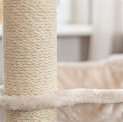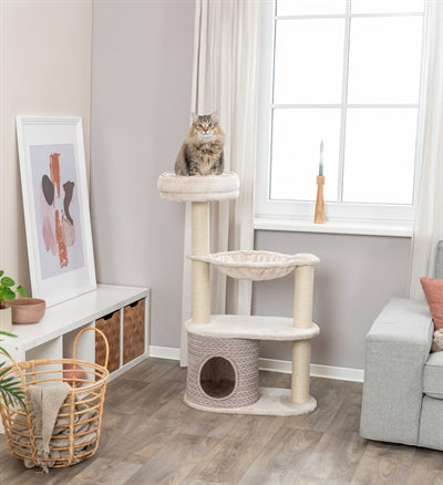 De Trixie Krabpaal Alessia Lichtgrijs/Zand 65X38X114 cm is vervaardigd uit hoogwaardige materialen zoals jute, pluche en velours. Het gevoerde ligplateau biedt extra comfort en wordt geleverd met een afneembare relax-mand. De schuilplaats, gemaakt van zacht velours, biedt je kat een knusse plek om te rusten. Daarnaast is de krabpaal uitgerust met een hangmat, perfect voor ontspanning. Ideaal voor katten die graag krabben, spelen en ontspannen in stijl.